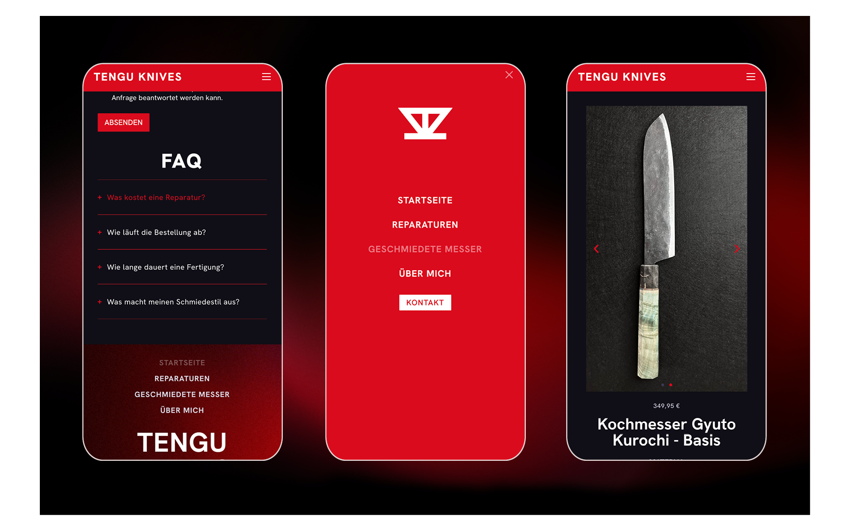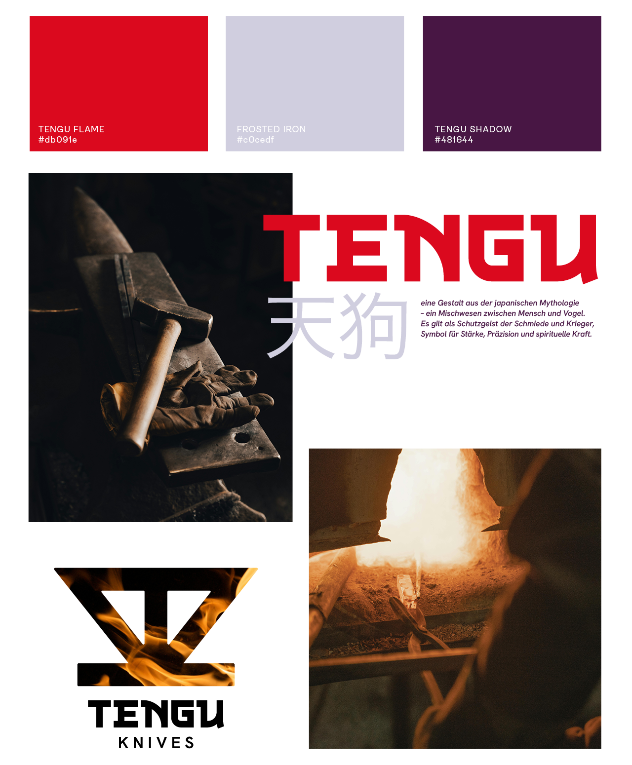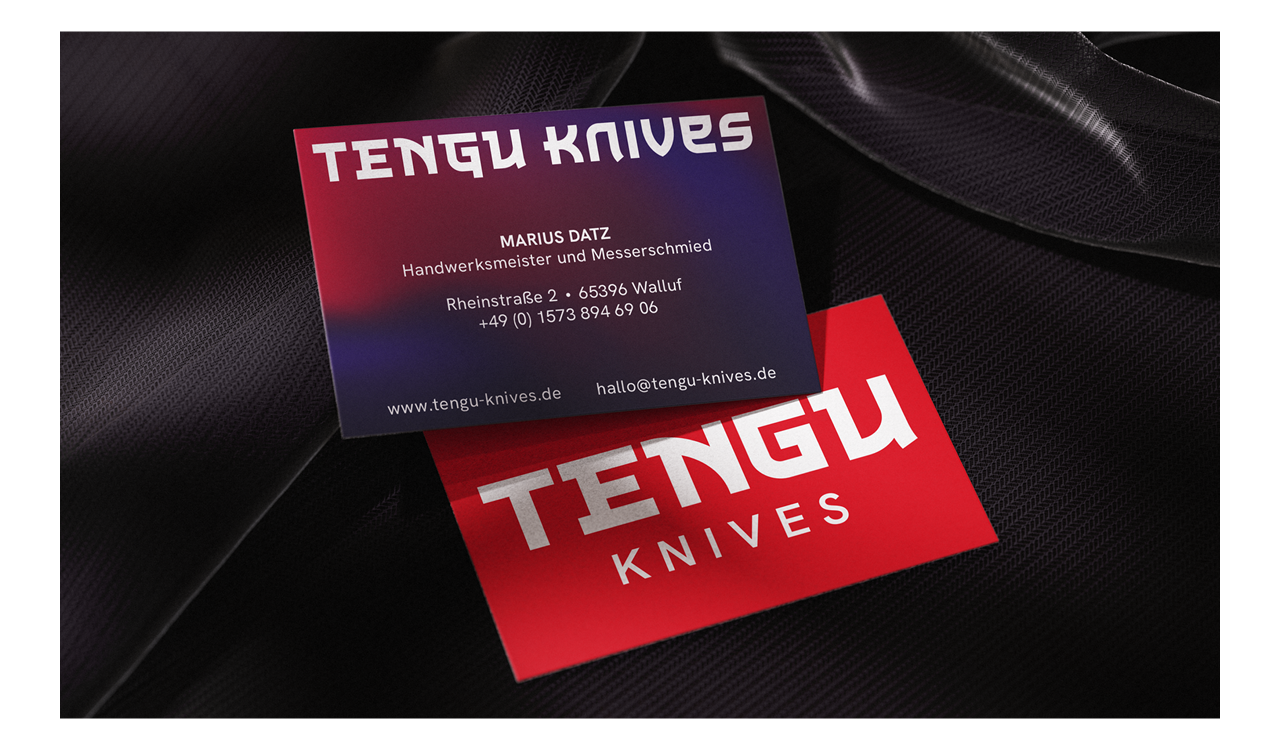Für Tengu Knives – eine neue Messerschmiede im Rheingau-Taunus-Kreis – habe ich ein ganzheitliches Branding entwickelt, das Tradition und Moderne verbindet. Ausgehend von der Markenidentität entstand ein individuelles Brand Design mit einem prägnanten Farbkonzept, Logo und typografischer Linie, die die Werte des Handwerks widerspiegeln: Präzision, Authentizität und Leidenschaft.